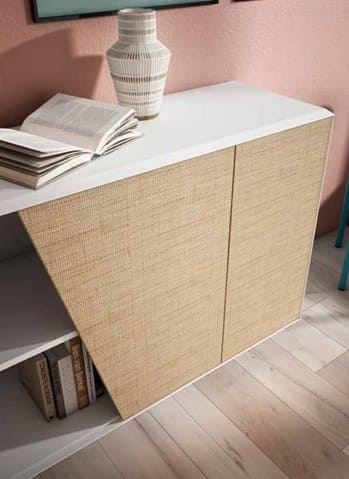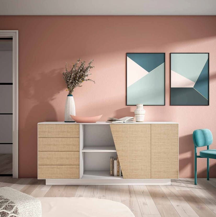 Destacan los frentes de cajón y puertas en acabado textil Rush y la puerta central de corte inclinado.