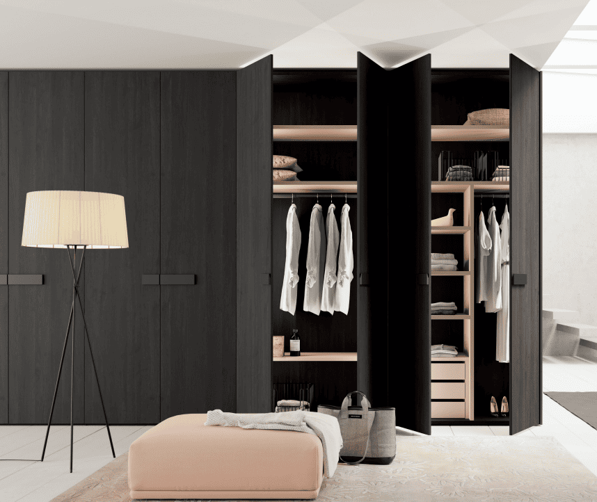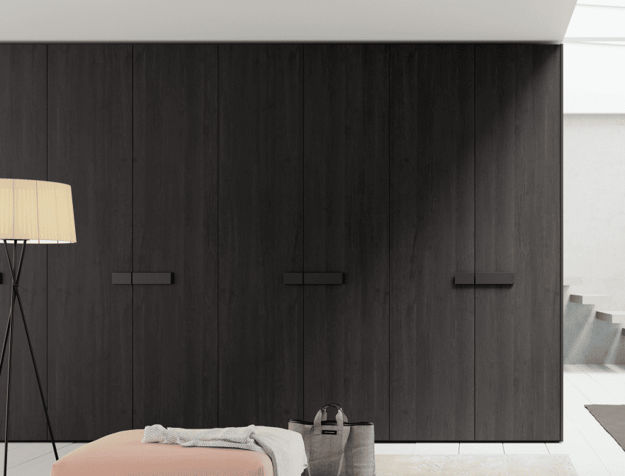 La solución con puertas batientes propone un sistema de apertura clásico. Para ello el armario incluye unas bisagras con freno que ofrecen un movimiento suave y elegante.