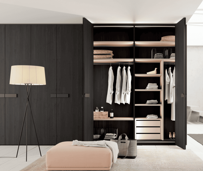 El sistema de puertas plegables ofrece una una amplia perspectiva del interior del armario. Su apertura mediante guías conduce el desplazamiento del frontal.