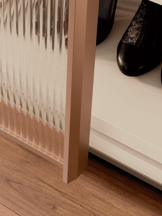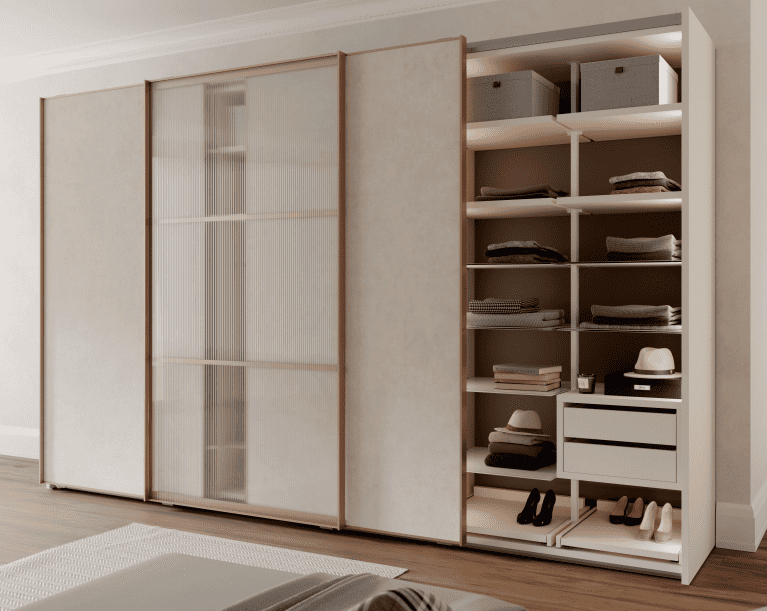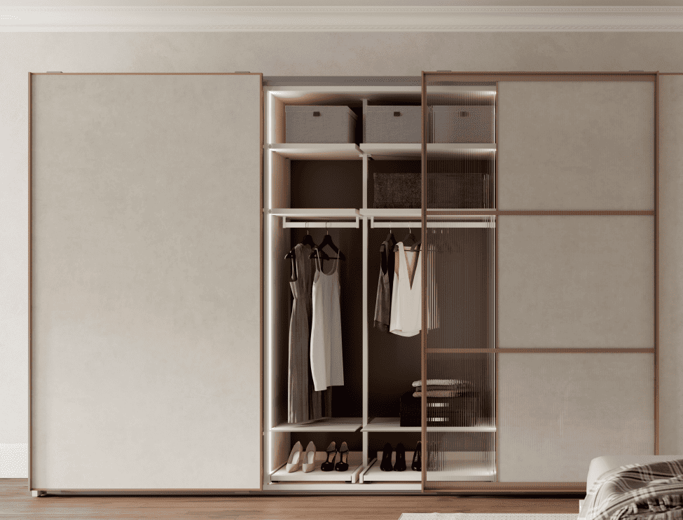 Los armarios de puerta corredera exterior proponen una estructura de aluminio combinable con cualquier tipo de acabado de la colección: laminado, cristal, con efectos piedra u óxido…