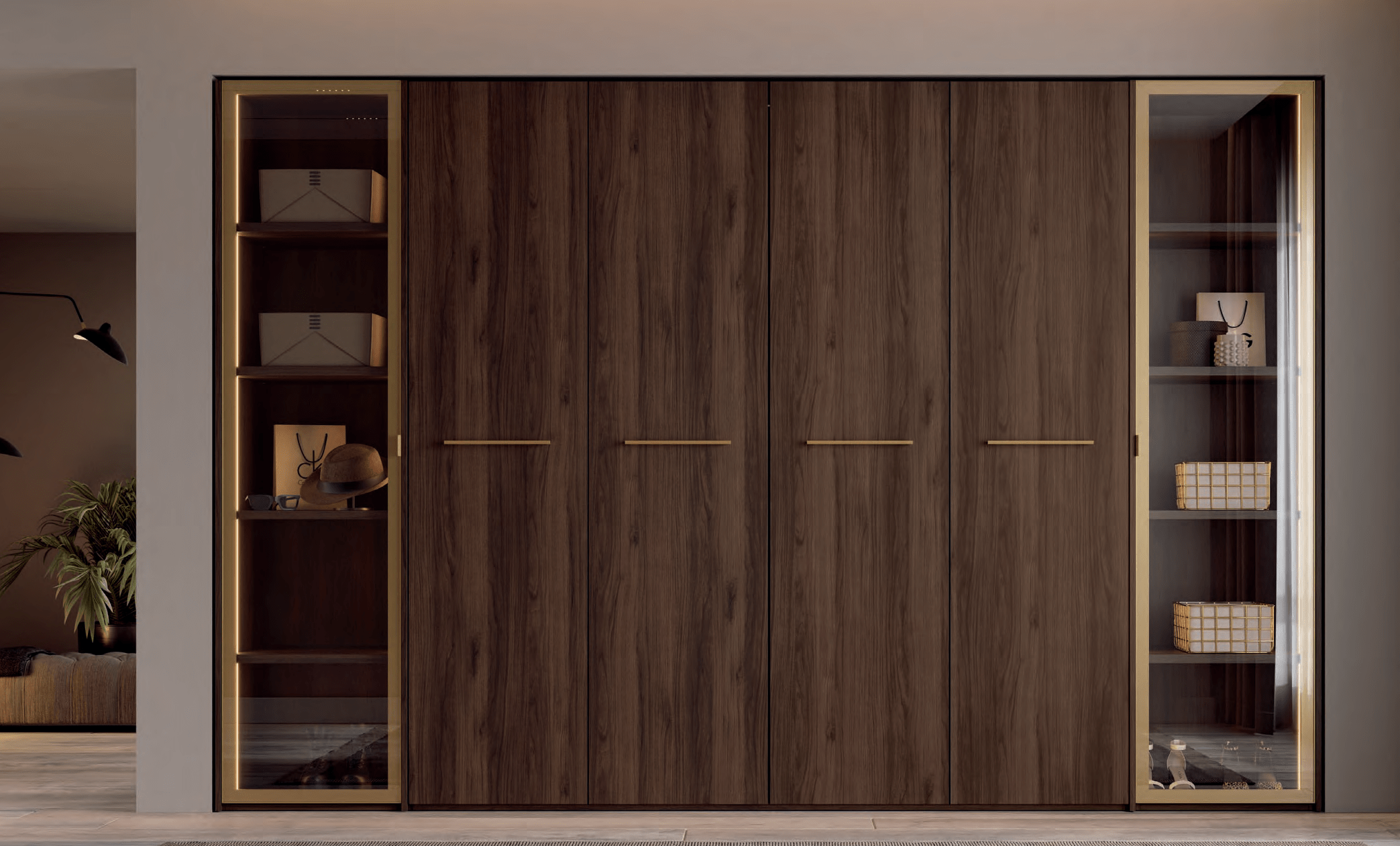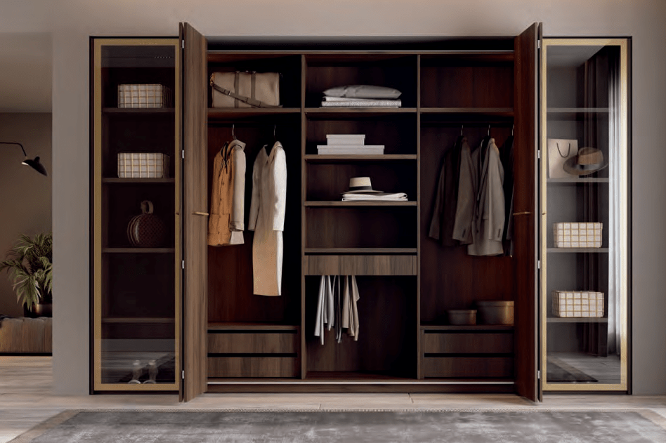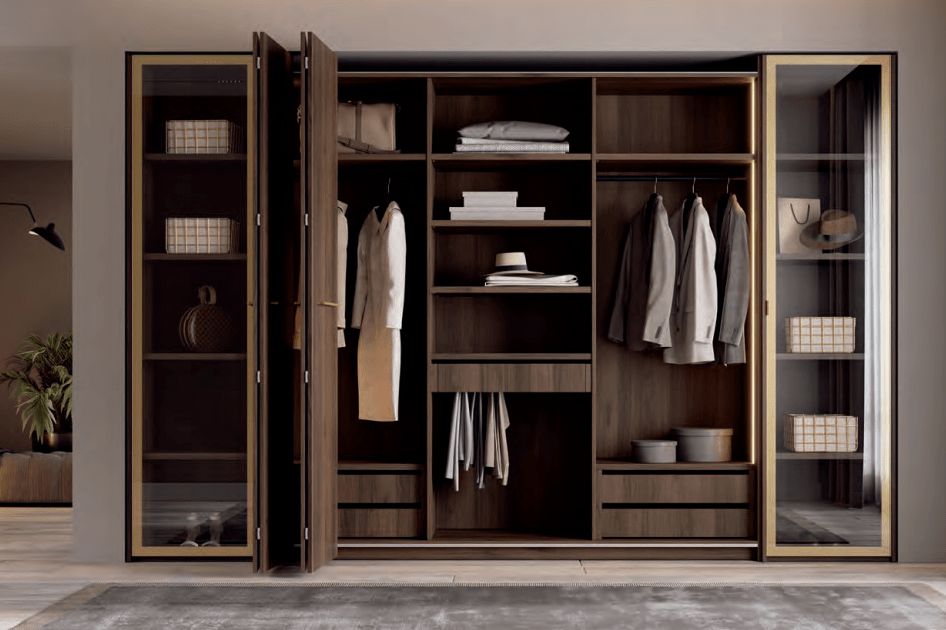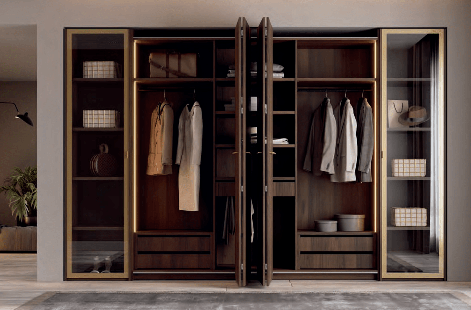 La combinación de puertas de madera color Catania con el marco de las puertas de vitrina y los tiradores en color Oro proporcionan a tu armario una elegancia y una calidez de otra dimensión. La iluminación led en los interiores de los armarios nos transmite calidez y naturalidad.