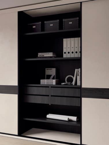 El contraste de dos colores, uno claro y otro oscuro, ofrecen en este despacho una estética muy elegante y sofisticada. El armario con 3 puertas correderas interiores BAND ofrece un amplio espacio de almacenaje de fácil acceso, dado que la puerta central corre tanto de un lado como del otro.