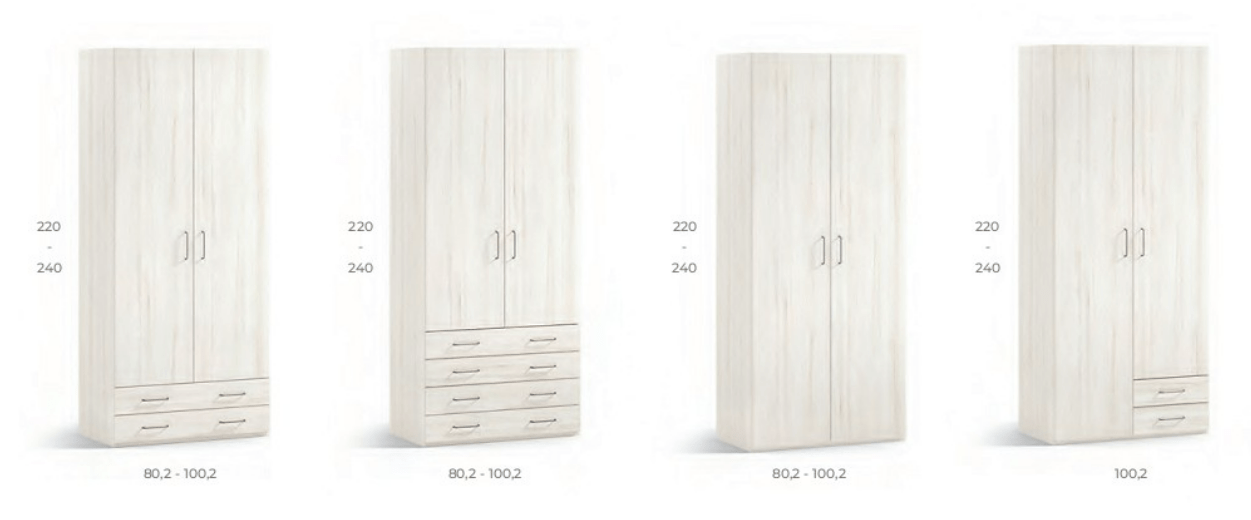- Armarios con 2 cajones ancho total, 4 cajones ancho total, 2 cajones ancho parcial y 4 cajones ancho parcial.