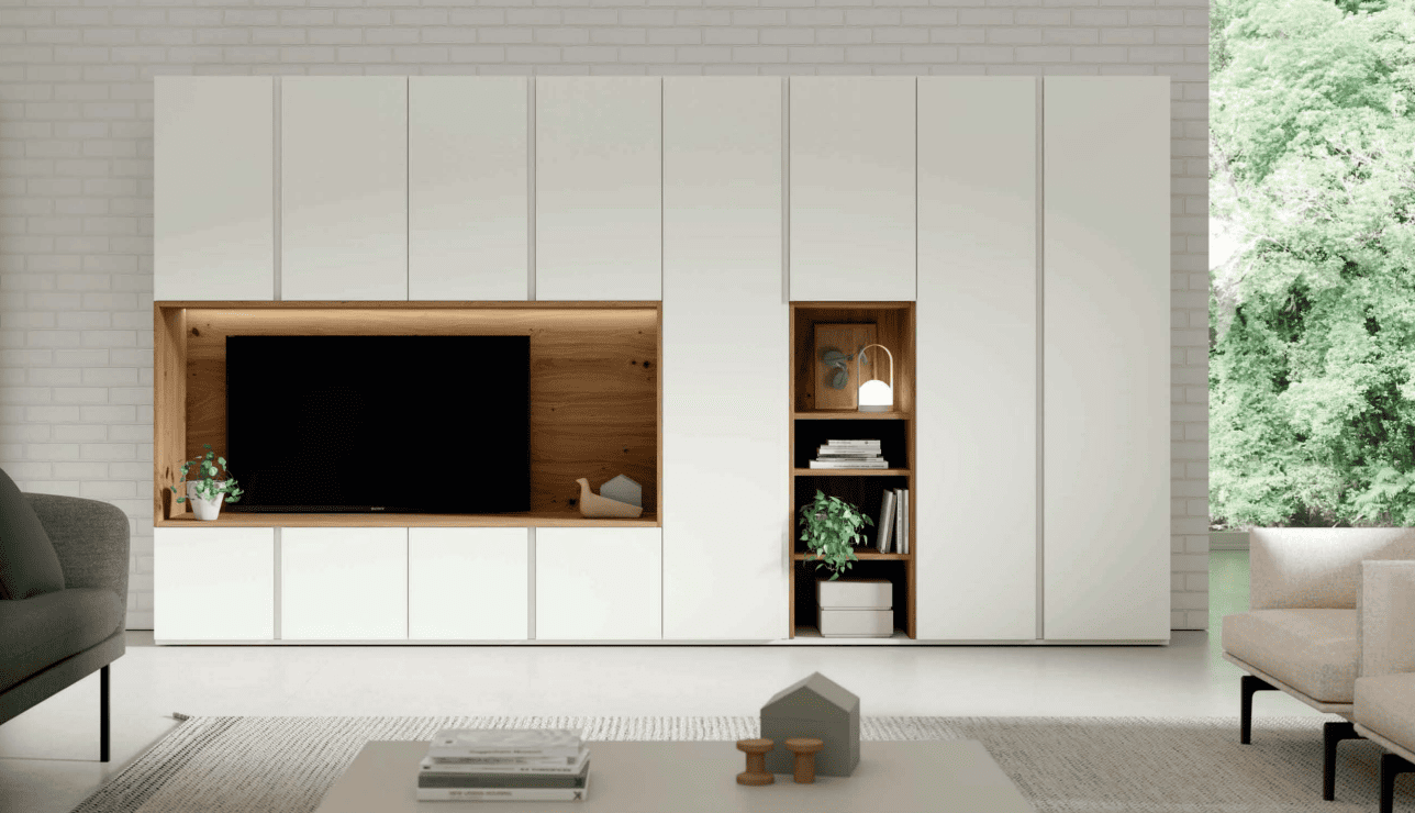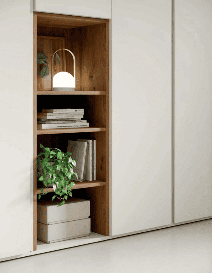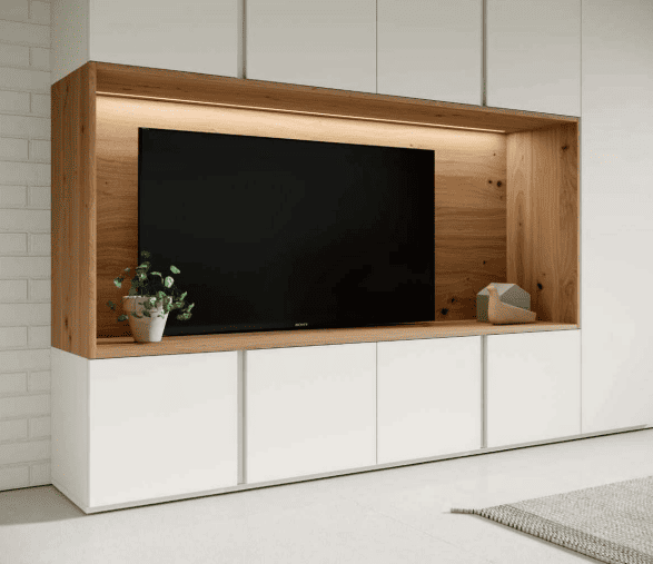 Hueco para TV con opción de luz con mando, para poder encender, regular y apagar la luz. Estantería para almacenar libros, objetos bonitos y plantas.