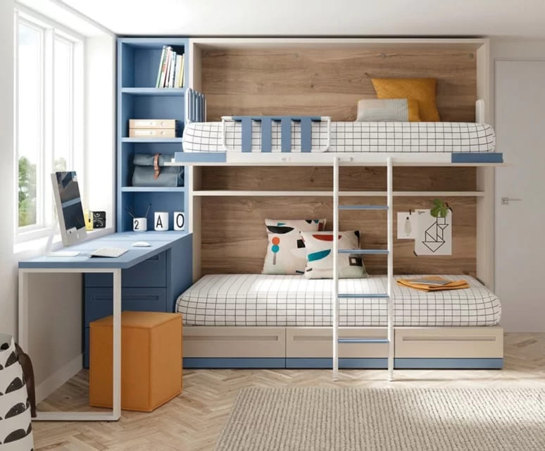 Con estos muebles vas a poder aprovechar mejor la habitación, con la cama cerrada los niños tendrán más espacio para poder jugar, donde hemos incorporado unos complementos interiores que te harán la vida más cómoda.