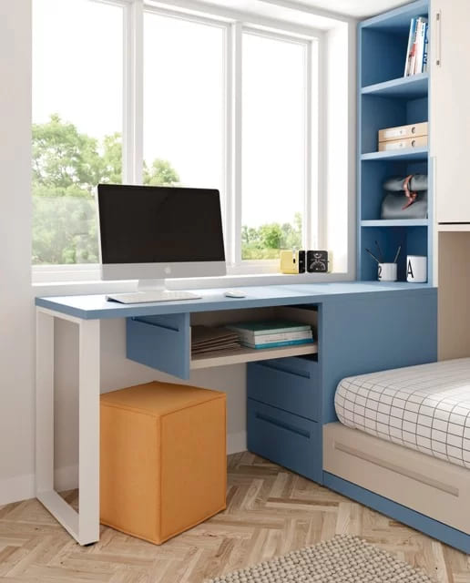 Almacenaje muy práctico para habitaciones pequeñas. El cabezal de la cama oculta la amplia cajonera del escritorio.