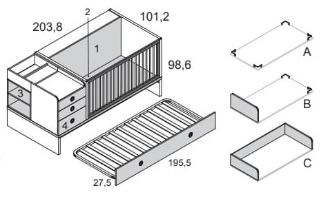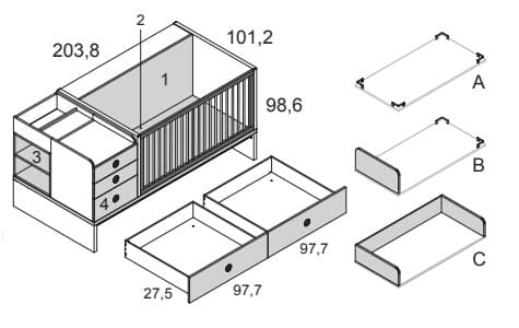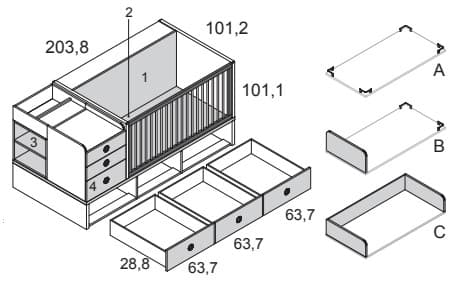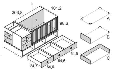 Tapa con arrastre, 2 cajones nido con ruedas, 3 cajones de 24,7, 3 cajones fijos con guías