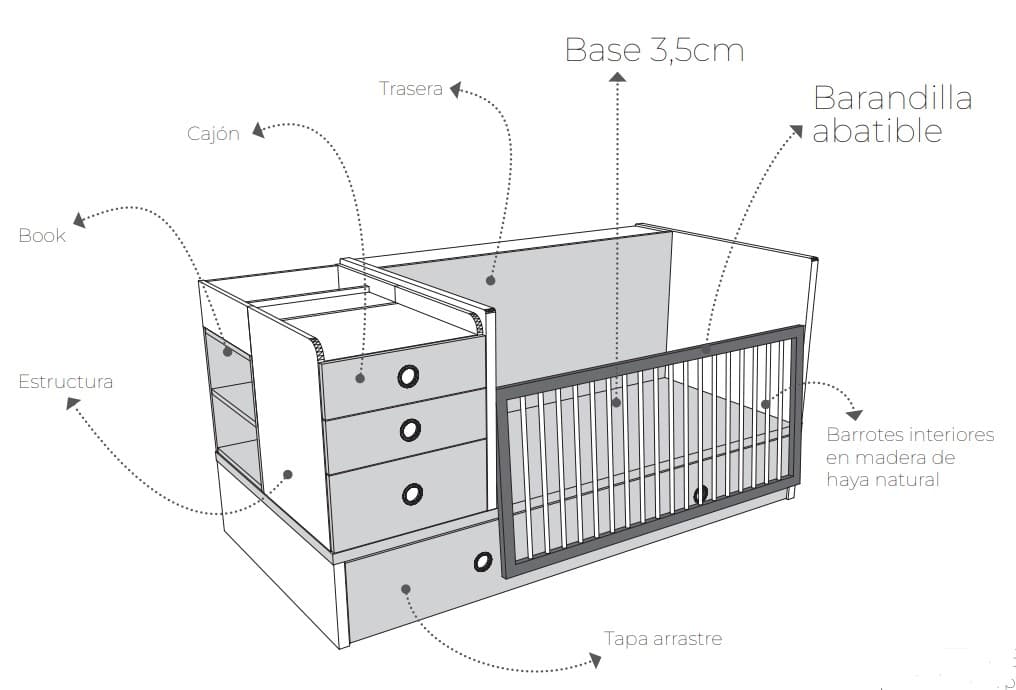 • Barandilla abatible con marco blanco y barrotes redondos acabado madera natural.