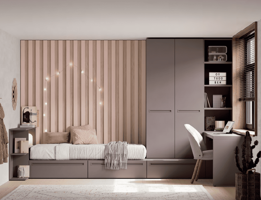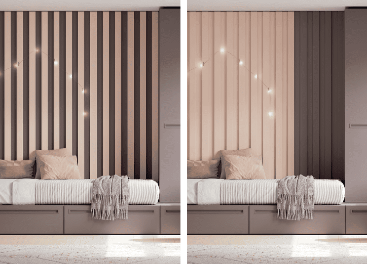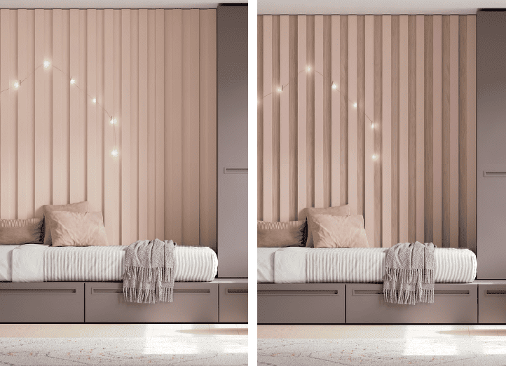 Paneles STRIP: Los paneles de pared con franjas verticales son un recurso de gran efecto para personalizar la habitación. En este caso, en dos acabados que buscan generar una mayor sensación de calidez.