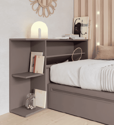 El cabezal multifunción de la cama propone una original solución de mesita de noche.