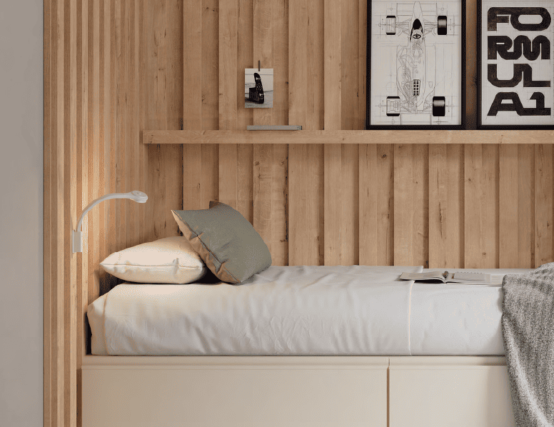 El panel de pared incorpora una práctica luz articulada con cargador para móvil, una solución práctica y flexible.