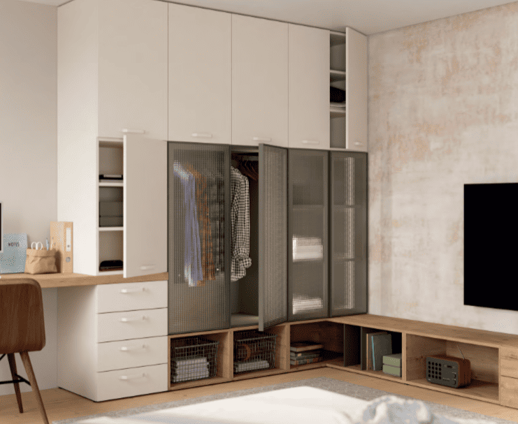 El armario multifunción se estructura con espacios abiertos, módulos cerrados, sumando cajones y completado con un atractivo juego de puertas de cristal. Una muestra de su alto grado de personalización.