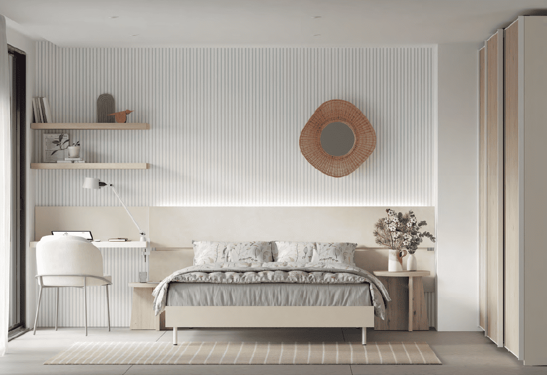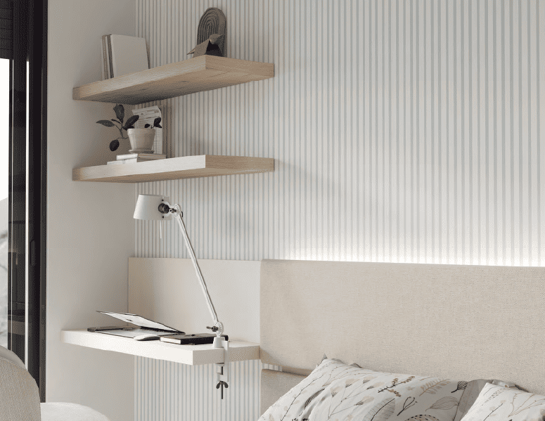 Una idea para integrar una zona de trabajo de pequeño tamaño y gran practicidad. La solución se sitúa al lado del cabezal buscando el máximo aprovechamiento del espacio.