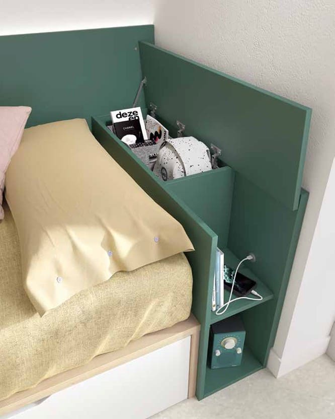- Arcón cabecero tapa abatible con estantería lateral derecha con salvarrodapié 101 x 79,5 x 32 cm.