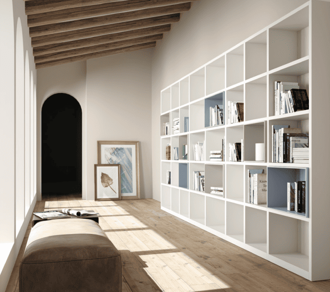 Librería modular compuesta por 4 módulos de 500 mm y 4 módulos de 400 mm intercalados sin trasera.