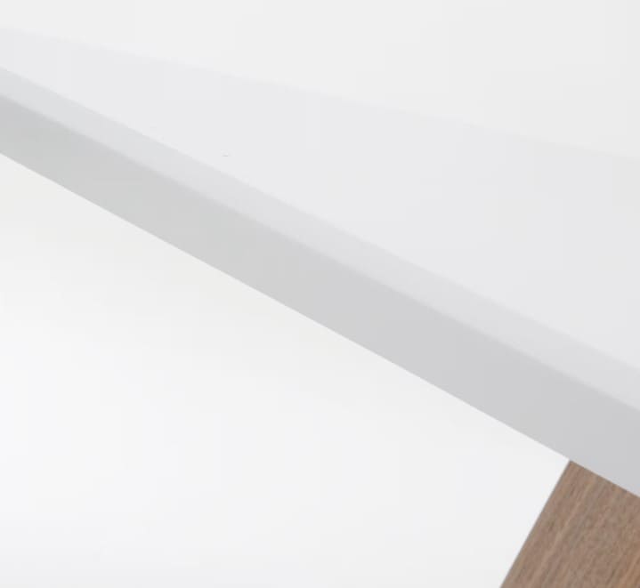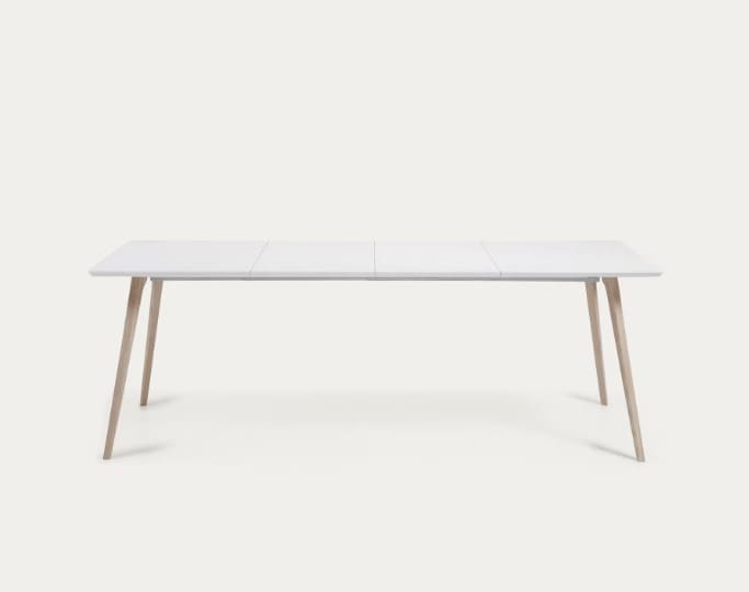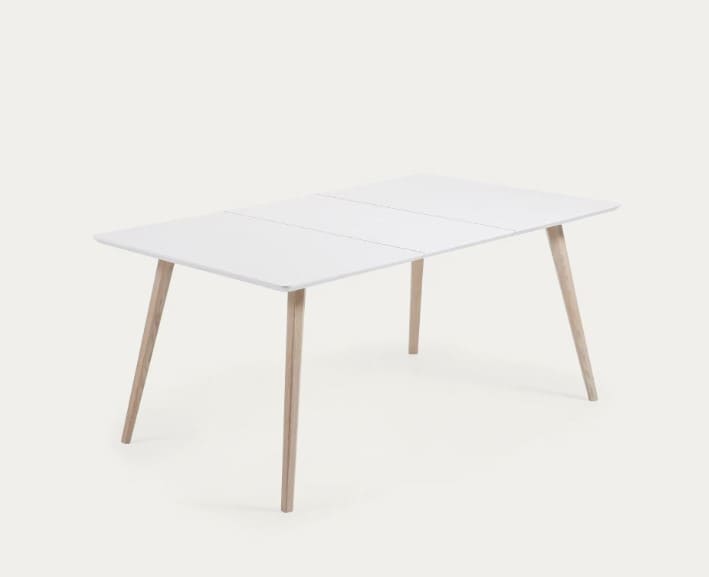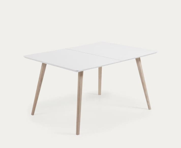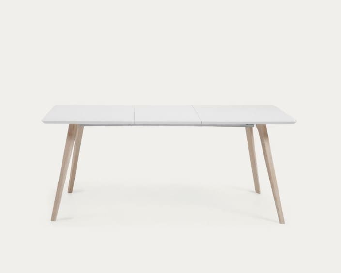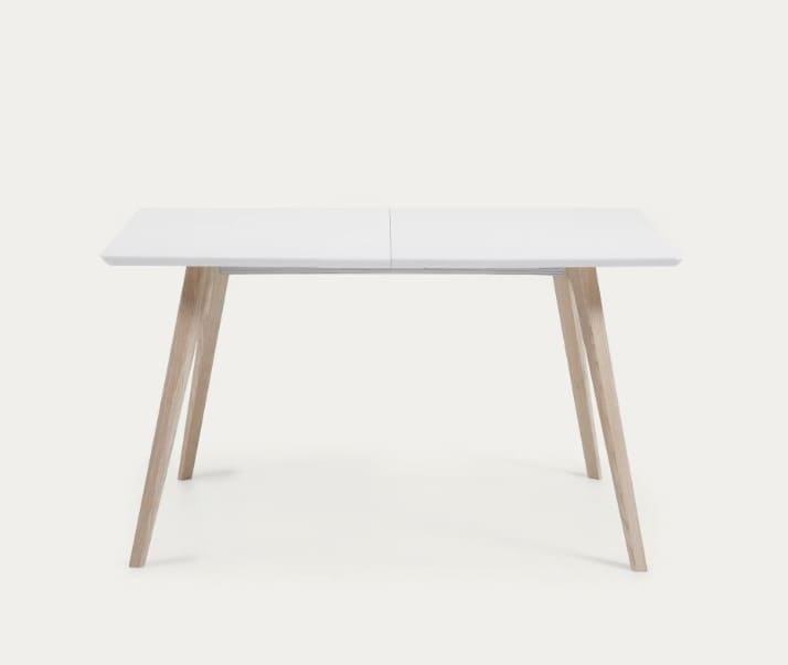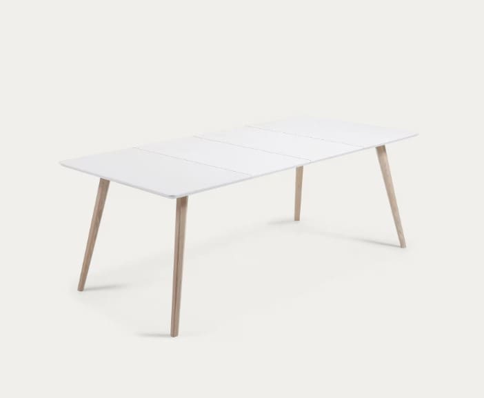 - Mesa extensible con sobre DM con acabado blanco y patas de madera maciza de fresno