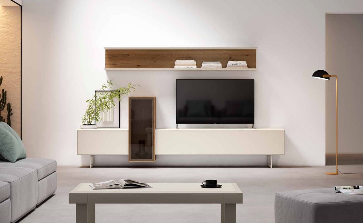 Composición moderna y atractiva donde destaca el acabado de la chapa natural de la trasera de la estantería combinada con el lacado Humo. Esta propuesta se construye con el módulo bajo de puerta abatible con patas metálicas y el módulo vitrina que destaca como pieza central.