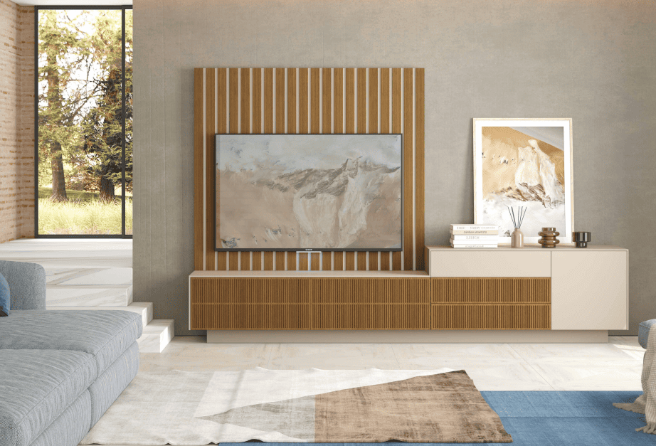 Salón Oslo 09, acabados en Roble Amelado – Arena mate.