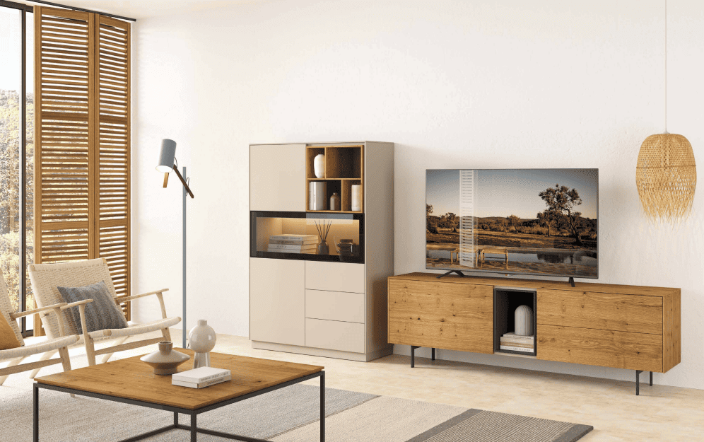 Salón Oslo 14, acabados en Roble Viejo Almendra Claro – Arena mate – Carbono mate.