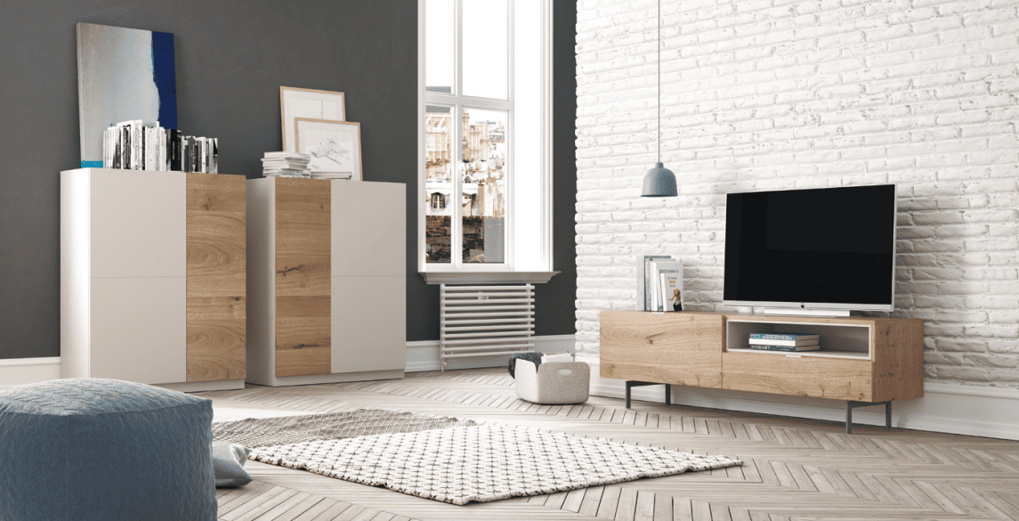 Salón Oslo 2.1 03, acabados en Roble viejo natural – Arena mate – Pardo mate.