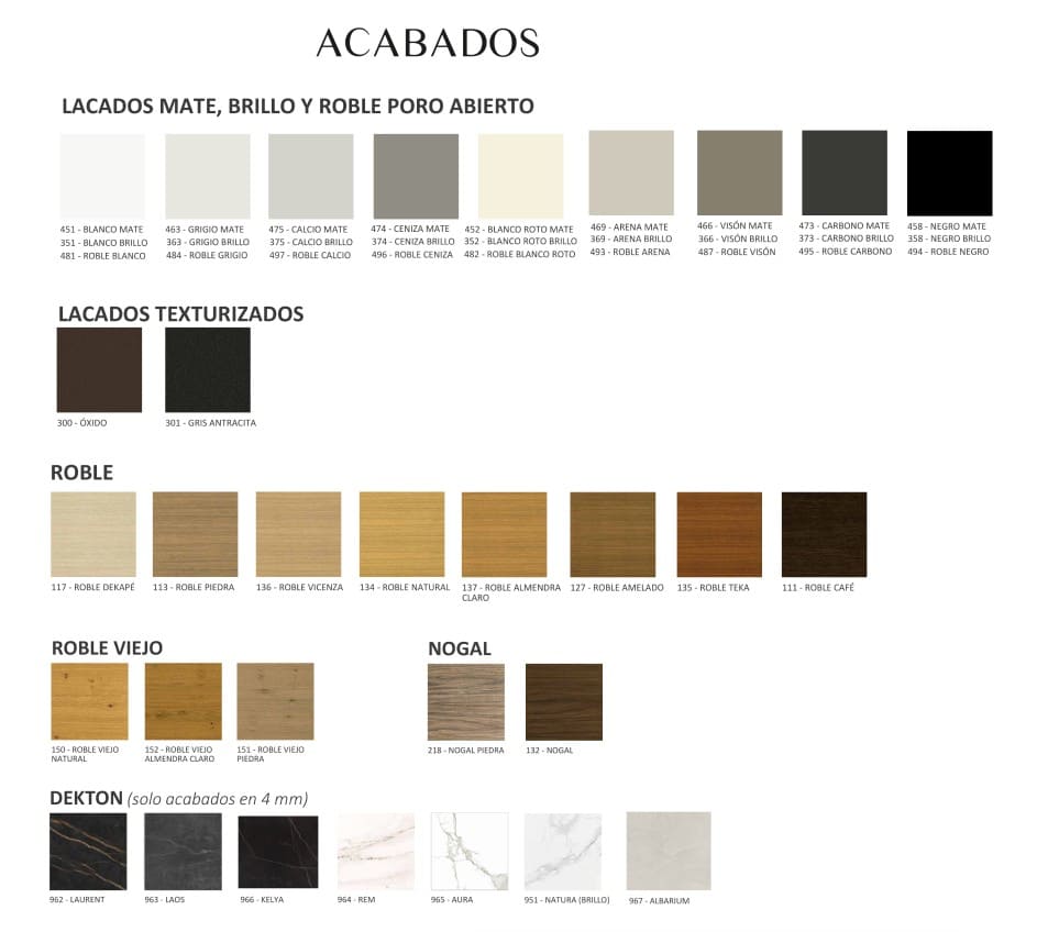 - Acabados en Roble Amelado – Visón mate – Negro mate – Dekton Rem.