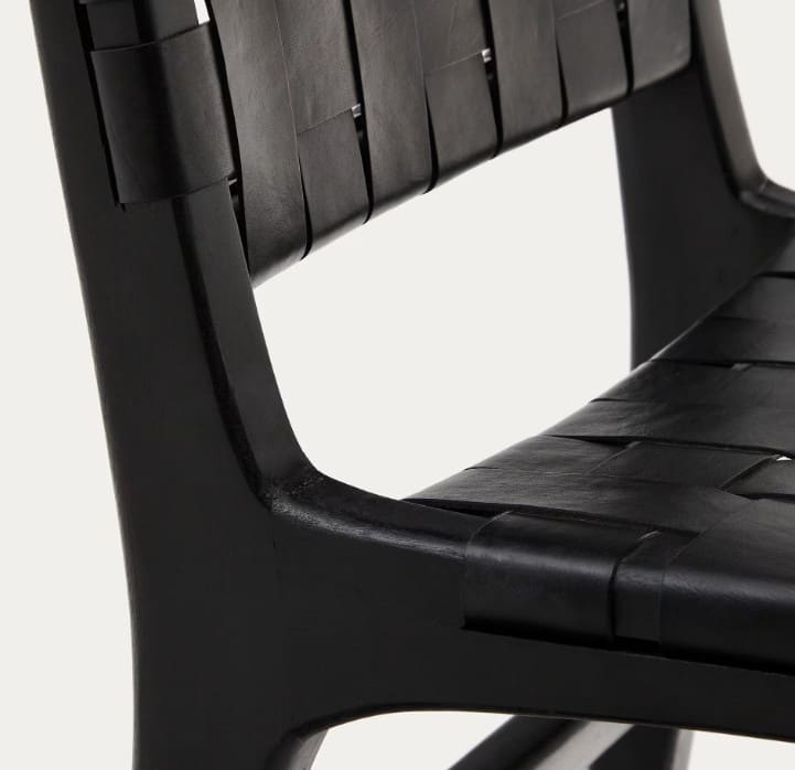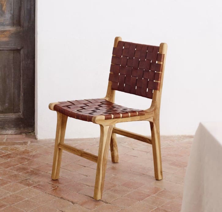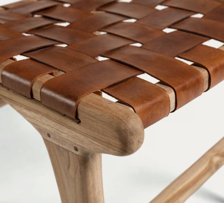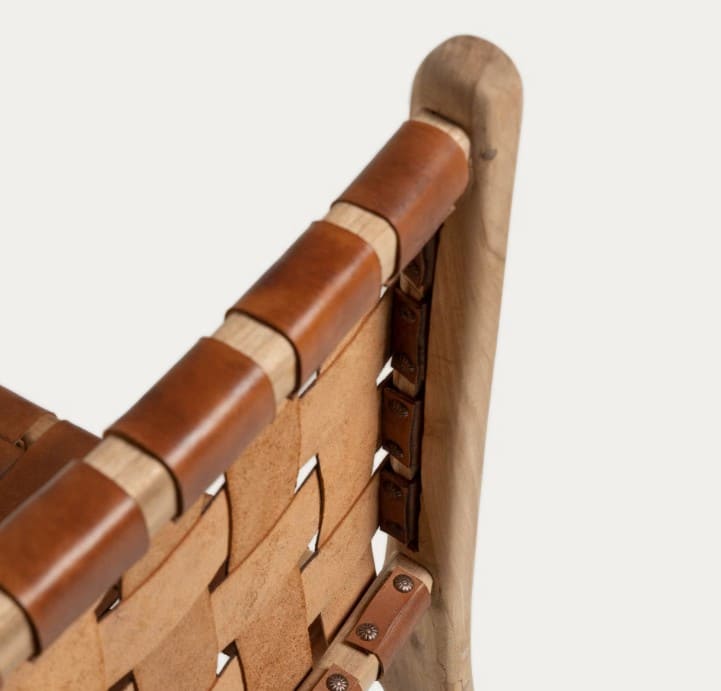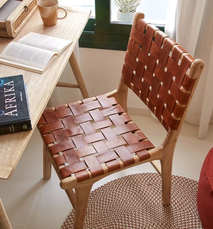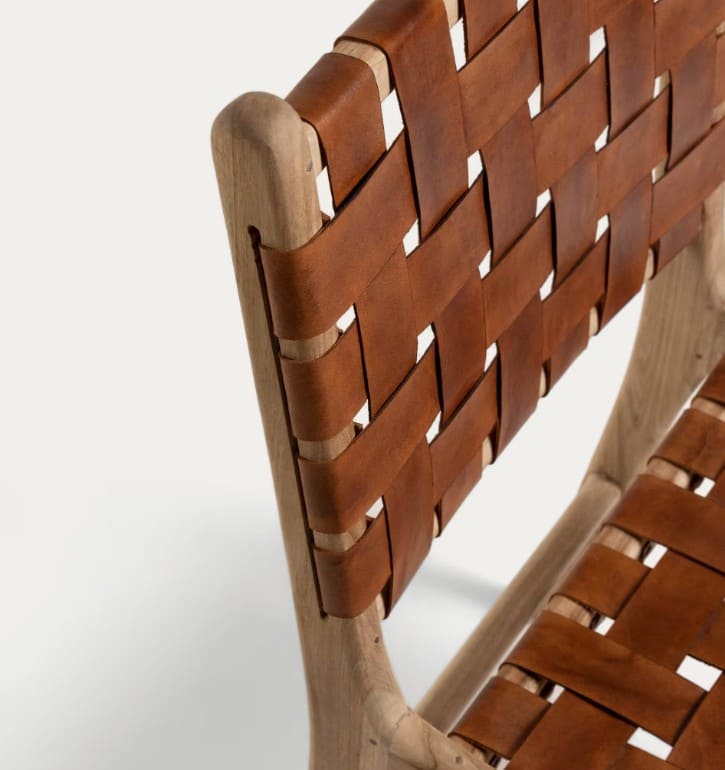 Para mayor autenticidad aún, cada una de las sillas Calixta está hecha artesanalmente, como el trenzado de las tiras de piel del asiento o el trato con la madera.