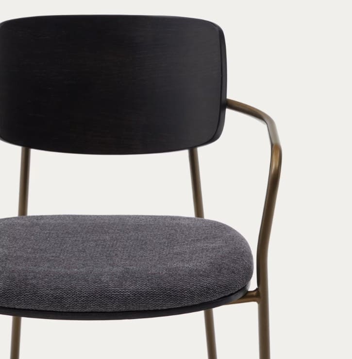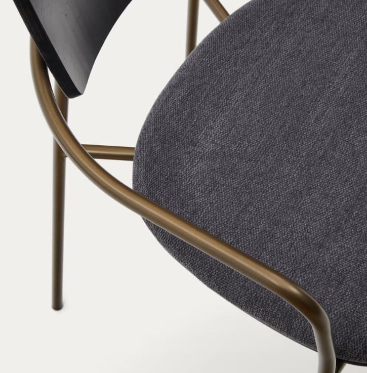 - Asiento tapizado en chenilla gris.