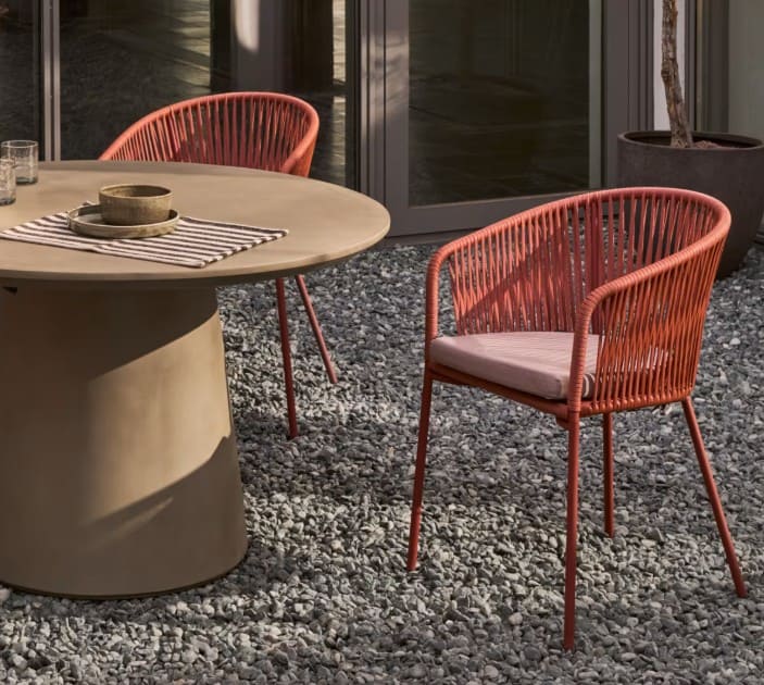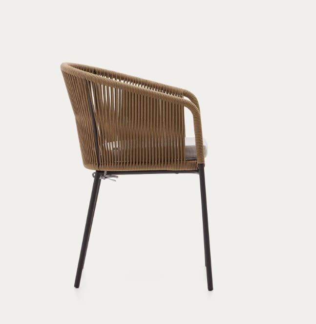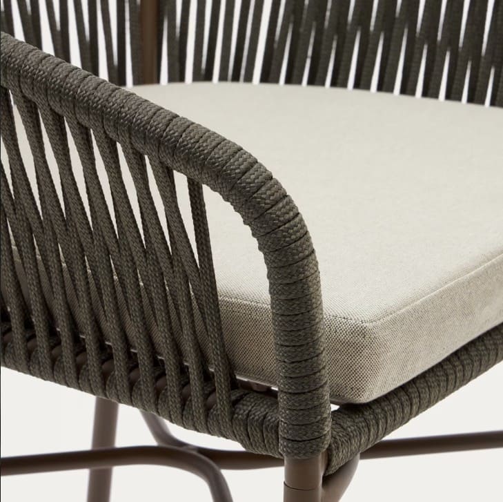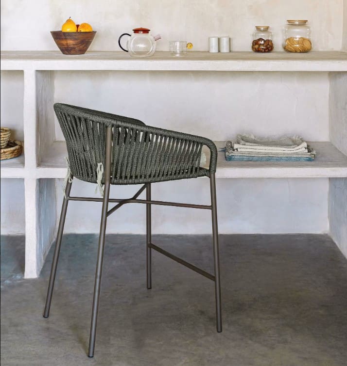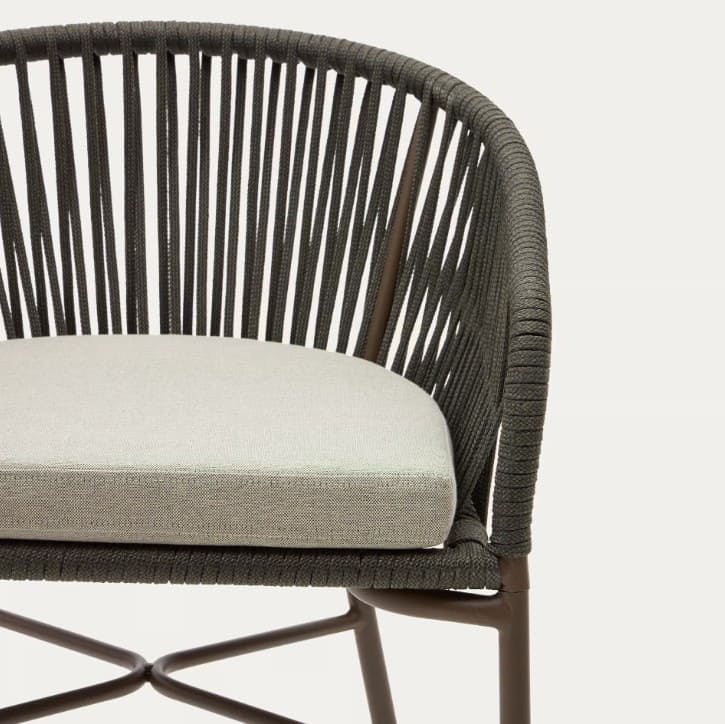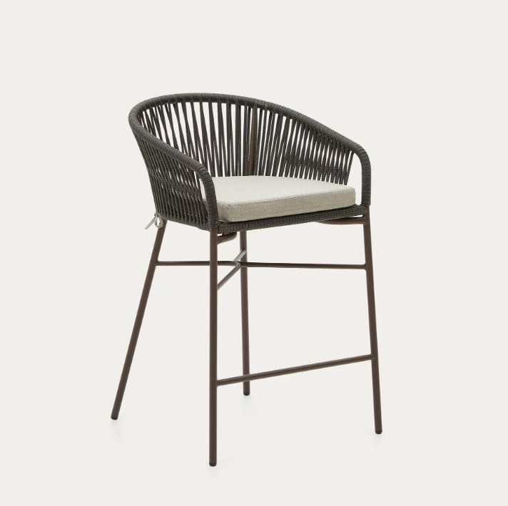 Las sillas y taburetes Yanet destacan por su funcionalidad y diseño. El acero galvanizado de su estructura es un material altamente resistente, ideal para su uso en espacios exteriores. Su asiento, diseñado con cuerda trenzada a mano, está disponible en terracota, verde, beige, crudo o negro, para que elijas el que mejor combina con tu estilo.