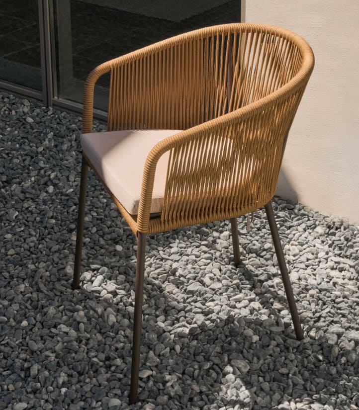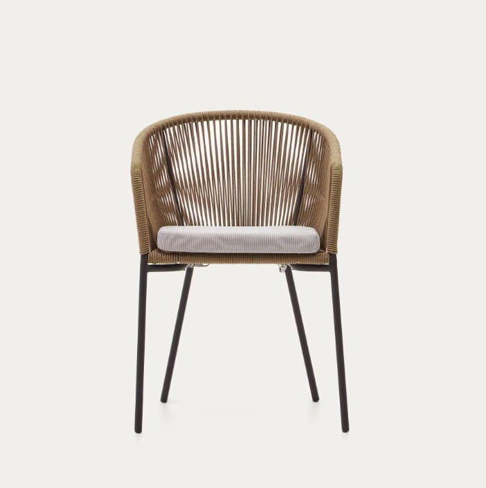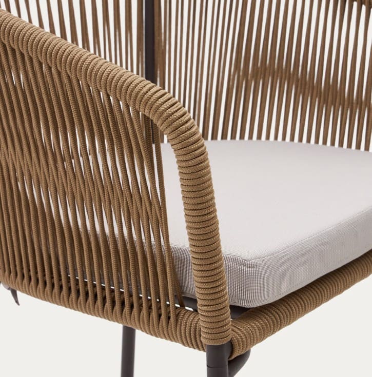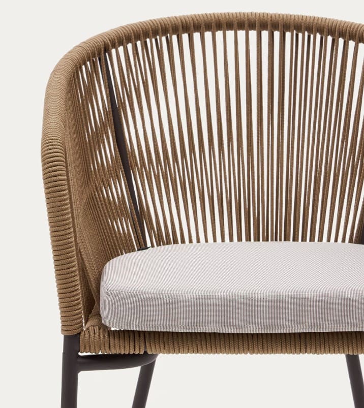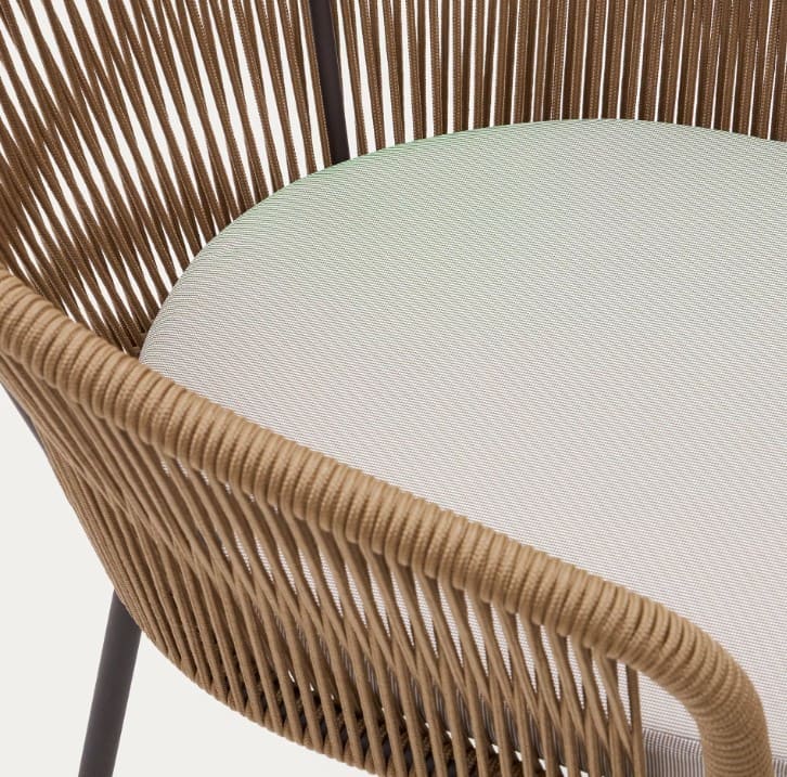 Disfruta con Yanet de tu terraza. La cuerda del asiento es resistente a los rayos UV y la estructura de acero galvanizado para poder usarlo en exteriores bajo techo.
