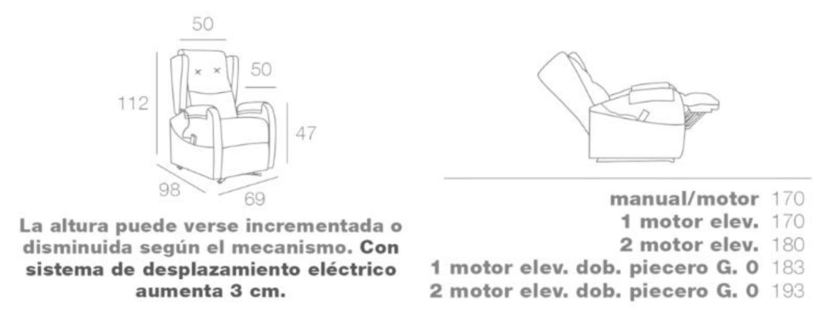 | Activación | Relax manual pared 0 – palanca lateral, Relax manual giratorio balancín – palanca lateral, Relax 1 motor pared 0 – botonera en brazo, Relax 1 motor doble piecero G.0 – botonera en brazo, Relax 1 motor giratorio balancín – botonera en brazo, Relax 1 motor elevador pared 0 – mando con cable, Relax 2 motores elevador – mando con cable |