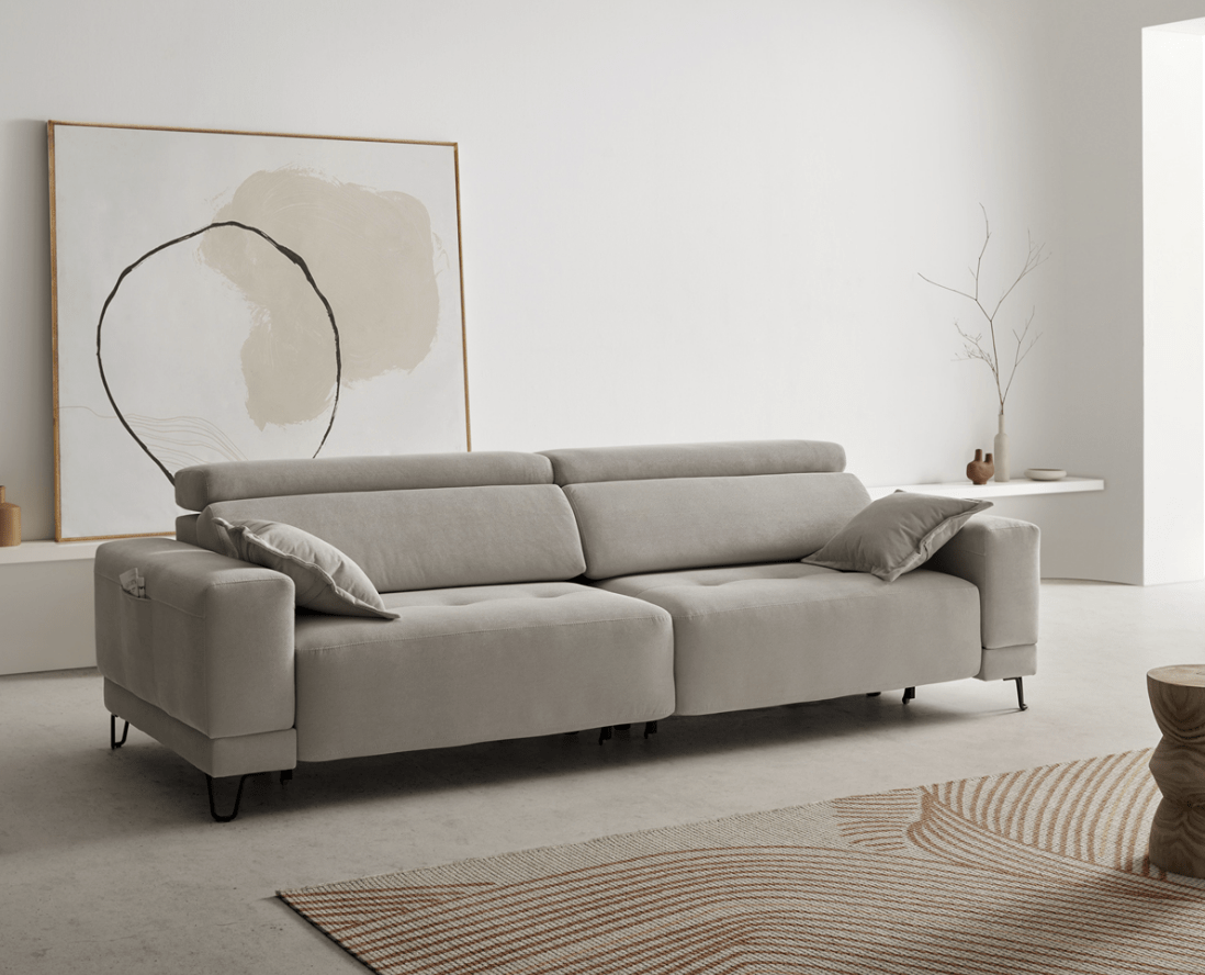 El sofá FLOW tiene un diseño minimalista y muy actual. Con carro deslizante de máxima calidad y cabeceras tipo italianas reclinables. Es un sofá muy versátil ya que está disponible en diferentes anchos de asiento, desde 70 cm. hasta sentadas extra anchas de 120 cm.