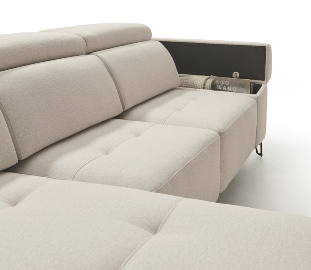 Disponible en brazo recto con bolsillo con cojín decorativo, o en brazo siesta con arcón. Ambas opciones con mecanismo deslizante en brazo para que puedas recostarte de lado. Al ser fabricado bajo pedido puedes elegir la tela y color que desees.