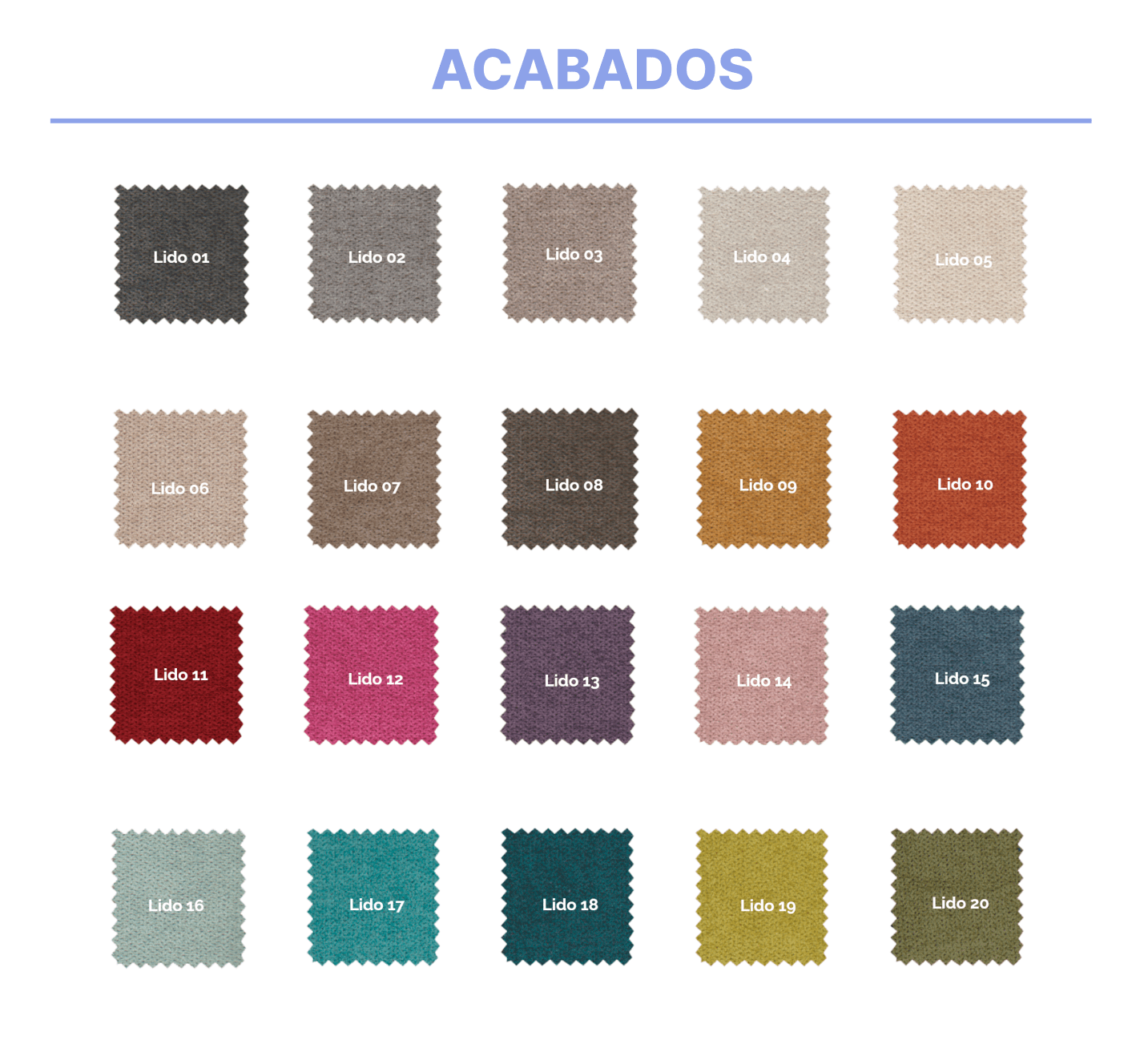 | Acabados | Lido 1, Lido 2, Lido 3, Lido 4, Lido 5, Lido 6, Lido 7, Lido 8, Lido 9, Lido 10, Lido 11, Lido 12, Lido 13, Lido 14, Lido 15, Lido 16, Lido 17, Lido 18, Lido 19, Lido 20 |